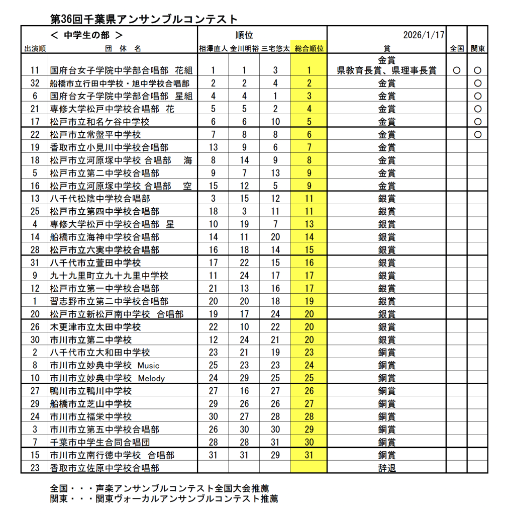 第36回千葉県合唱アンサンブルコンテスト審査結果【中学生の部 】