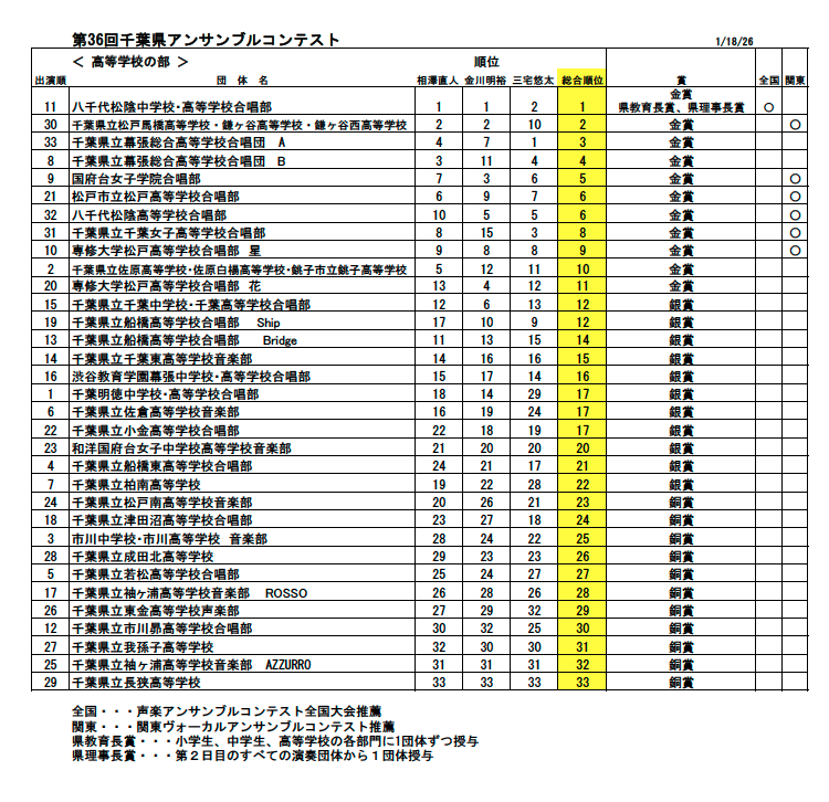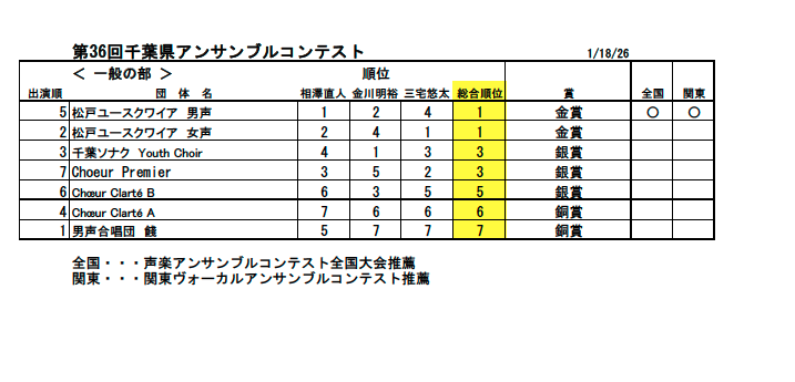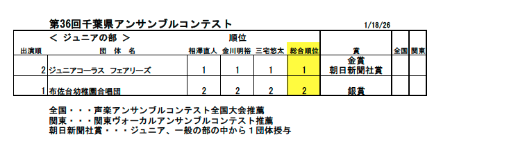 アンサンブルコンテスト/2026-01-182026-01-18/ chibaca 第36回千葉県合唱アンサンブルコンテスト審査結果【高等学校の部】【ジュニアの部】【一般の部】 第36回千葉県合唱アンサンブルコンテスト【高等学校の部】【ジュニアの部】【一般の部】について、1月18日に実施された審査の結果を掲載いたします。 PDFファイル 【高等学校の部】【ジュニアの部】【一般の部】 高等学校の部 ジュニアの部 一般の部